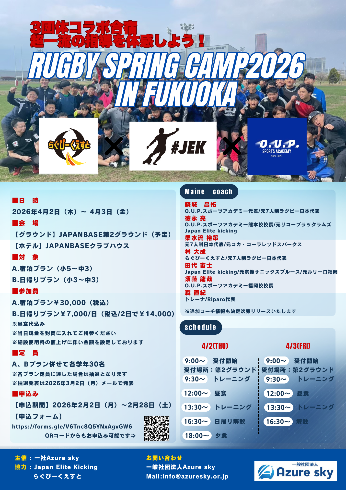 の3団体がコラボしたRUGBY SPRING CAMP2026in福岡の開催が決定いたしました‼️